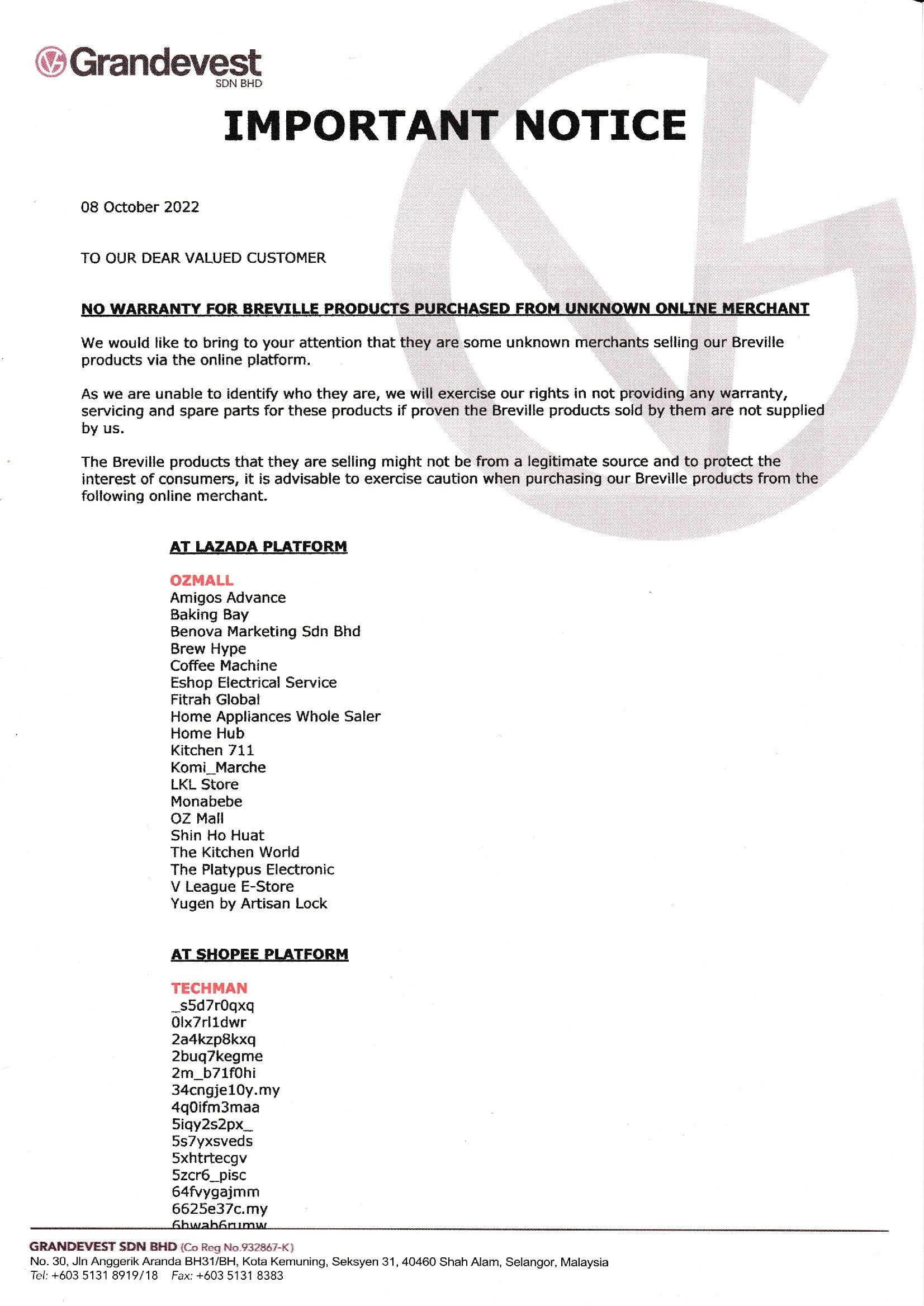 No Warranty For Breville Products Purchased from Unknown Online Merchant